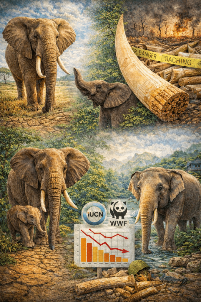 Primary threats are poaching for ivory, habitat loss and fragmentation, human-elephant conflict (HEC), and climate change impacts on water and forage. We researched seizure and trend data: ivory seizure trends show large-scale trafficking routes persist, while some nations report decreases after enforcement increases. IUCN categories vary: African forest elephants are Critically Endangered in many assessments; Asian elephants are Endangered overall (IUCN Red List).